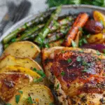 5 bone-in chicken thighs, fat trimmed 1 tbsp chili powder 2 tsp thyme 2 tsp herbs de Provence 1 tbsp minced garlic 2 tsp sea salt (to taste) 1 tsp black pepper (to taste) 8 oz cherry tomatoes 1 large zucchini, chopped 2 red or yellow potatoes, chopped (peeled optional) 2 tbsp olive oil