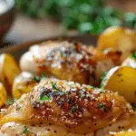 Golden, juicy chicken thighs and cheesy roasted potatoes come together in this comforting one-pan meal. Crispy skin, garlic butter, and Parmesan make every bite unforgettable.