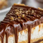 This no-bake Twix cheesecake has a buttery graham crust, rich chocolate layer, creamy cheesecake filling, and gooey caramel topping—perfect for a decadent dessert that’s easy to make.