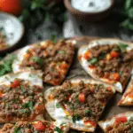 Mediterranean Mini Lahmacun Bites with Yogurt Drizzle featuring crispy thin dough topped with spiced lamb or beef and fresh herbs. A flavorful Middle Eastern inspired appetizer perfect for parties or family dinners.