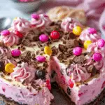The best pink M&M Snickers cheesecake with a rich chocolate base and fluffy pink filling, topped with candy for a stunning treat.