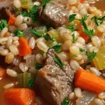 A hearty, comforting soup made with tender beef, wholesome vegetables, and chewy pearl barley, slow-cooked to perfection for a rich and flavorful meal.